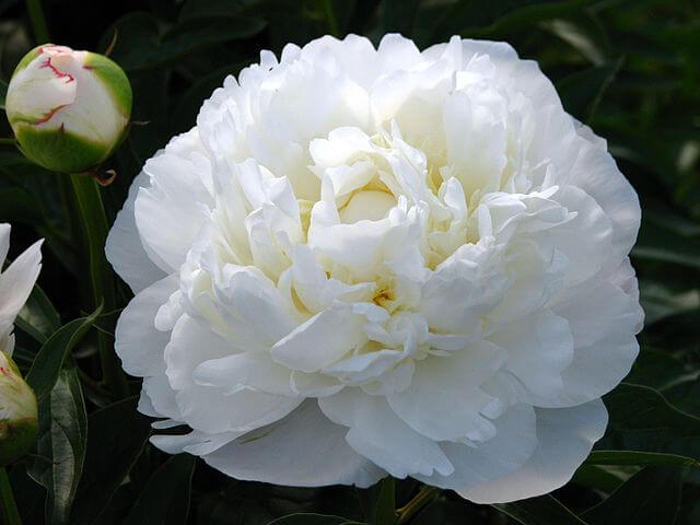 Травянистый пион Amalie Olson корончатый, полушаровидный, выделяется среди других цветов своими огромными, махровыми соцветиями. Лепестки - белые с бледно-розовым оттенком, со временем они становятся кремово-белыми. Из бутонов исходит такой пленительный аромат, что невозможно пройти мимо этого пиона. Стебли изгибаются под тяжестью соцветий, диаметр которых достигает 20 см и более. Срок цветения у этого пиона - среднепоздний. Высота 90 см.