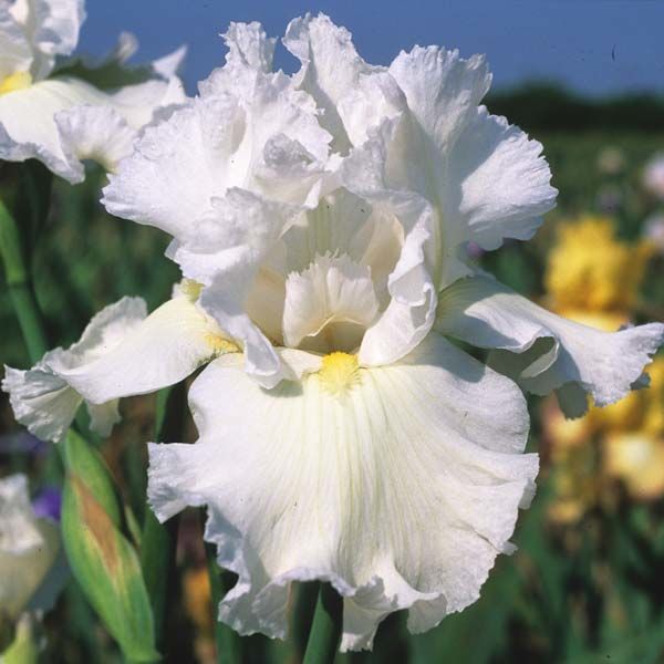 Многолетний ирис Arctic Age хорошо гофрированный льдисто белый. Бородки - лимонные с белым кончиком. Крепкая и плотная фактура, тонкая гофрировка. Высота цветоноса 95 см. Срок цветения поздний.